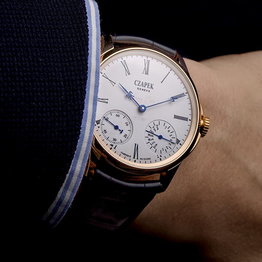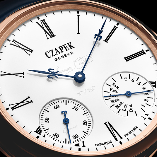 仕様:時・分・秒(スモールセコンド)・曜日表示、パワーリザーブ表示、ホワイトのグランフー・エナメル文字盤、シークレット・センテンス(12時位置に“Sursum Corda”、6時位置に“10/180”)、7時30分位置に“Czapek”のシークレット・シグネチャー、サファイアクリスタルケースバック