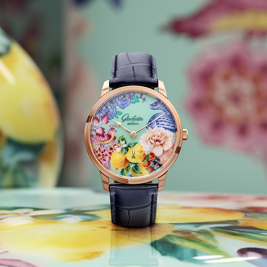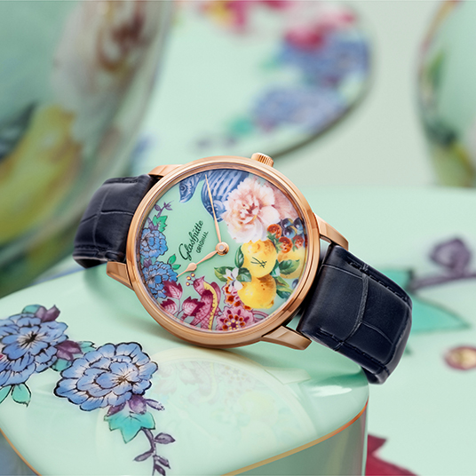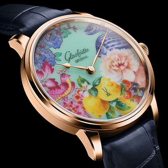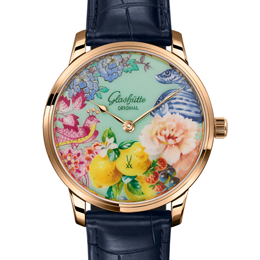 仕様:時・分表示、秒針停止機構(リューズを使用)、手描きの「コラージュ」装飾を施したマイセン磁器文字盤、サファイアクリスタルケースバック