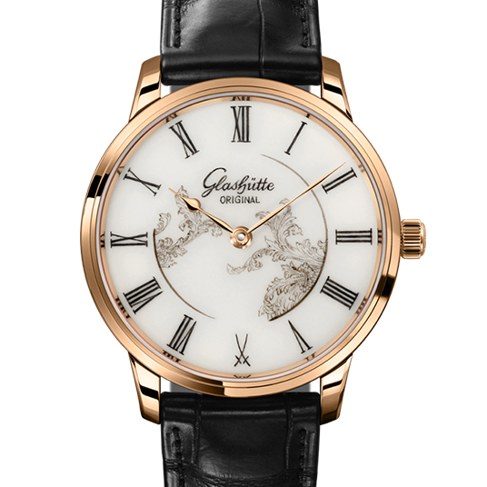 仕様:時・分表示、秒針停止機構(リューズを使用)、手描きのローマンインデックスおよび装飾を施したホワイトのマイセン磁器文字盤、サファイアクリスタルケースバック