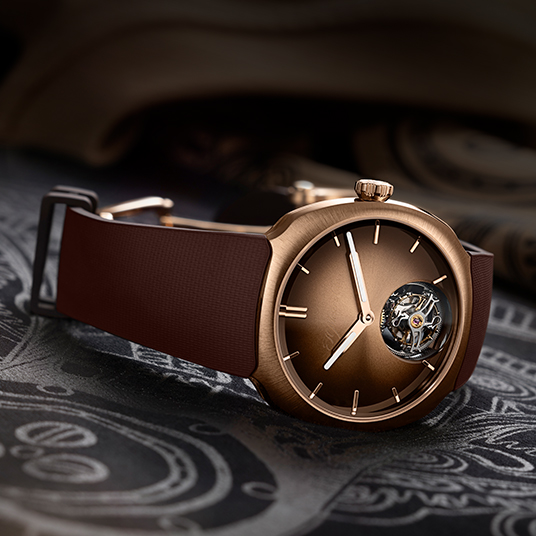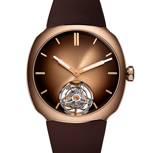 ストラップ:チョコレートカラーの一体型ラバーストラップ、H.モーザーのロゴが刻印された5Nレッドゴールド製ブレード付きフォールディングクラスプ