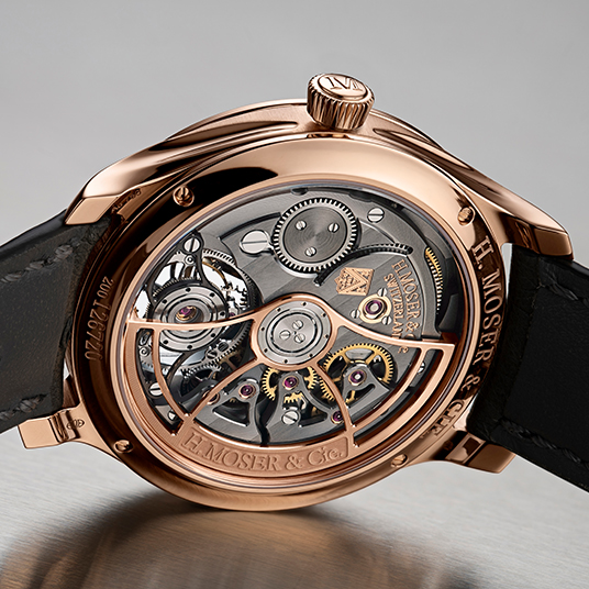 ストラップ:手縫いのグレー オーストリッチレザー、H.モーザーのロゴが刻印された5Nレッドゴールド製クラスプ