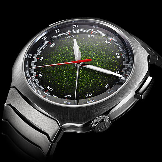 仕様:時・分表示、センター表示を採用し経過分および秒を表示するクロノグラフ、分および秒のフライバック、フロスト仕上げのマトリックスグリーン フュメダイアル、グロボライト®インサート付きの時針および分針、レッドのクロノグラフ針、フランジのタキメーター、シースルーケースバック