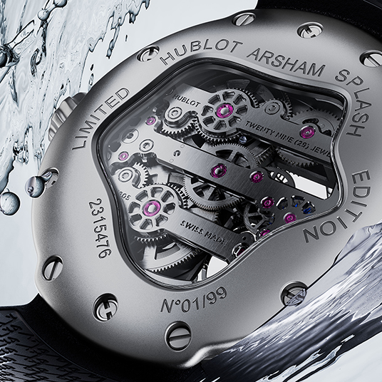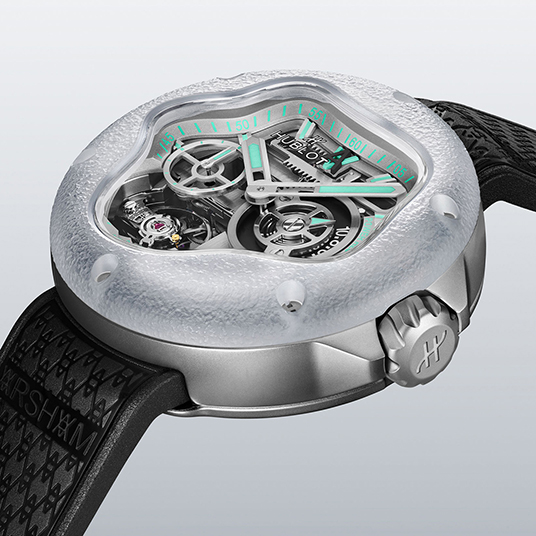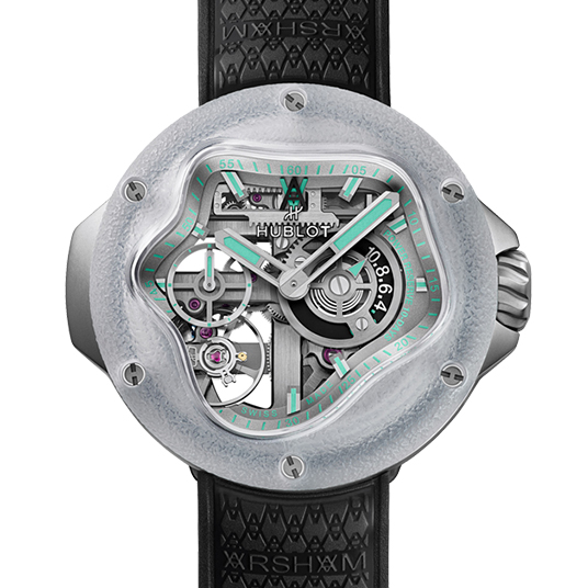 仕様:時・分・秒(スモールセコンド)表示、シャイニー仕上げのマイクロブラスト加工を施しアーシャムグリーンのスーパールミノバを塗布したロジウムダイアル、ポリッシュ仕上げ&レーザーテクスチャー加工のサファイアクリスタルベゼル、6個のH型チタニウム製ビス、シースルーケースバック