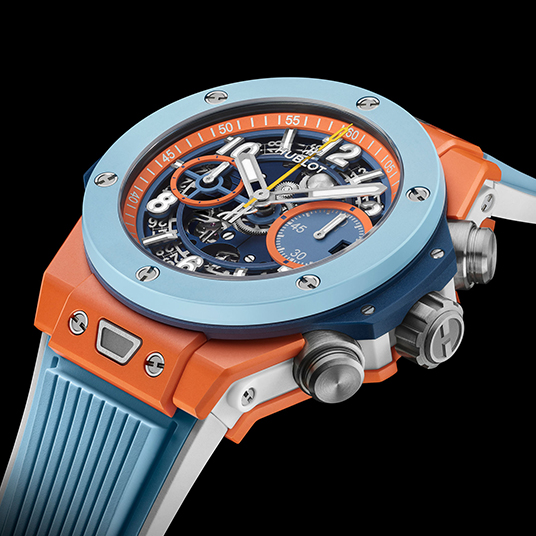 仕様:時・分・秒・日付表示、フライバック クロノグラフ、マイクロブラスト加工のブルーセラミックベゼル、マットブルー&オレンジダイアル、反射防止加工を施したサファイアクリスタルケースバック