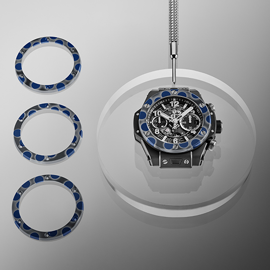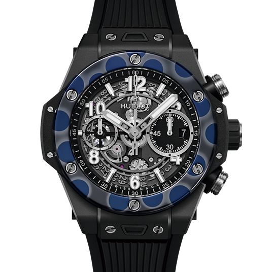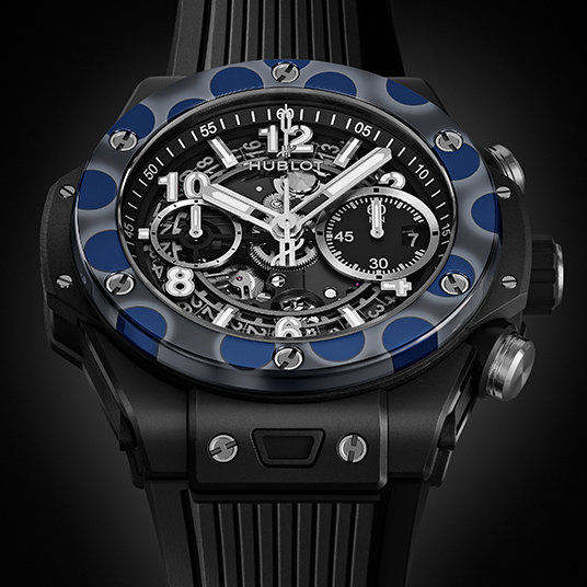 仕様:時・分・秒・日付表示、フライバック クロノグラフ、ポリッシュ仕上げを施したバイカラーブラックセラミックベゼル(トワイライトブルーのドット柄)、マットブラックダイアル、サファイアクリスタルケースバック