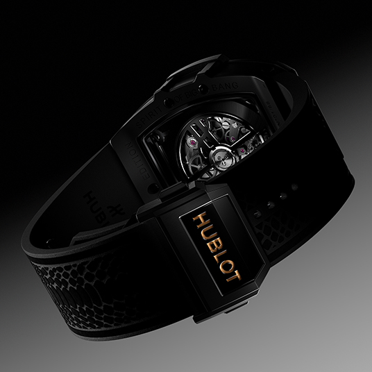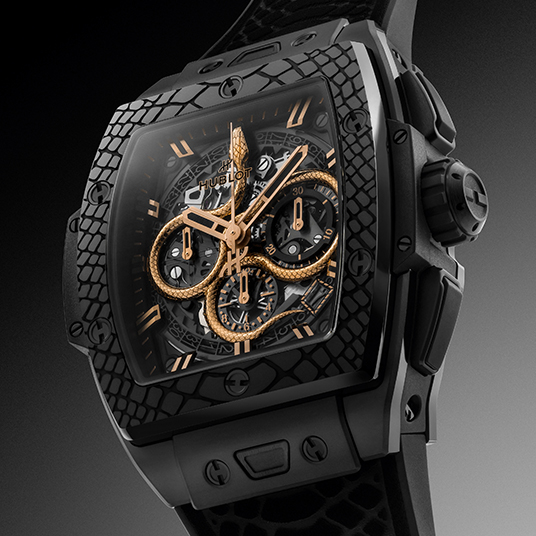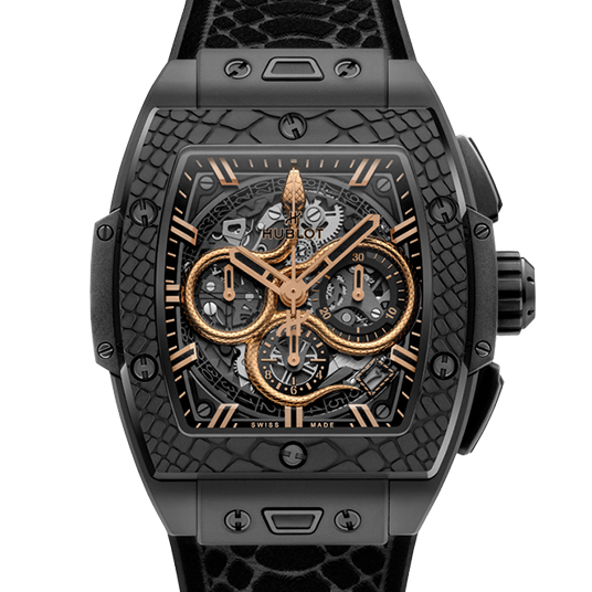 仕様:時・分・秒・日付表示、クロノグラフ、マイクロブラスト加工とポリッシュ仕上げのブラックセラミックにスネークスキンを模したテクスチャーの刻印、サファイアクリスタル ダイアル、ゴールドプレートのスネーク