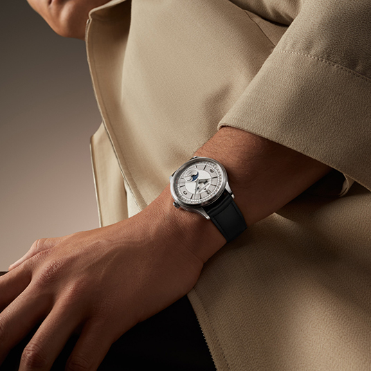 仕様:時・分・秒・日付・曜日・月表示、ムーンフェイズ、ツートーングレーのグレイン仕上げダイヤル、シースルーケースバック