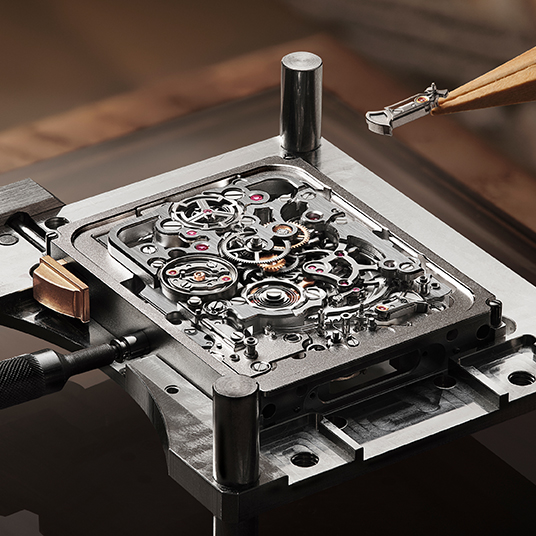 仕様:時・分表示(表および裏)、ミニッツリピーター、ティールブルーのエナメル加工ギョーシェ彫りダイヤル(表)、オープンワークダイヤル(裏)