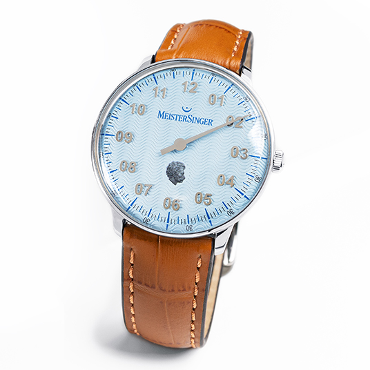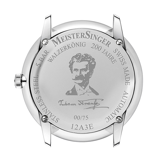 仕様:シングルハンドによる時刻表示、波状テクスチャー入りライトブルーダイヤル、ケースバックにシュトラウスの肖像とサインと限定番号を刻印
