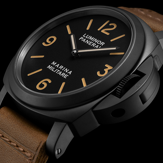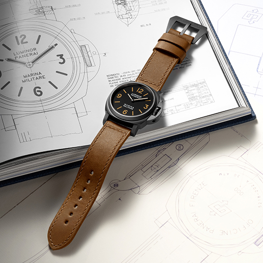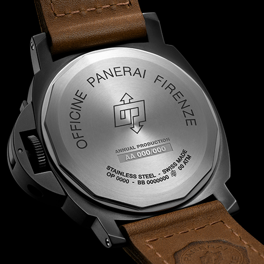 仕様:時・分表示、マットブラックのホローダイヤル、キャラメルカラーのスーパールミノバ®、6時位置にマリーナミリターレのテキスト、オフィチーネ パネライとOPロゴのエングレービング入りのスティール製スクリューケースバック