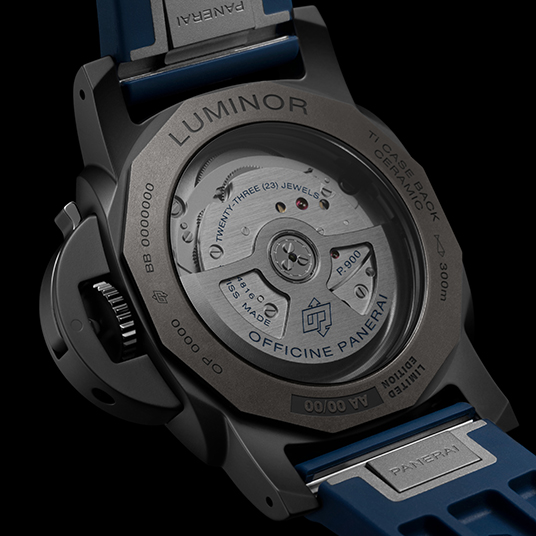 ストラップ:ブルーラバー、PAMクリックリリースシステム™のストラップとバックル、ホワイトステッチ入りブラックカーフのスペアストラップが付属