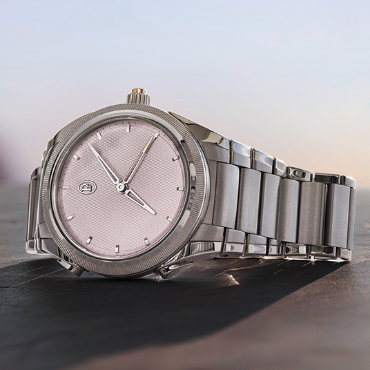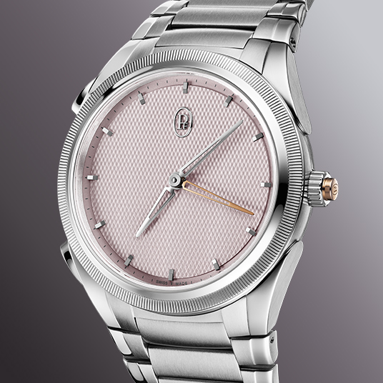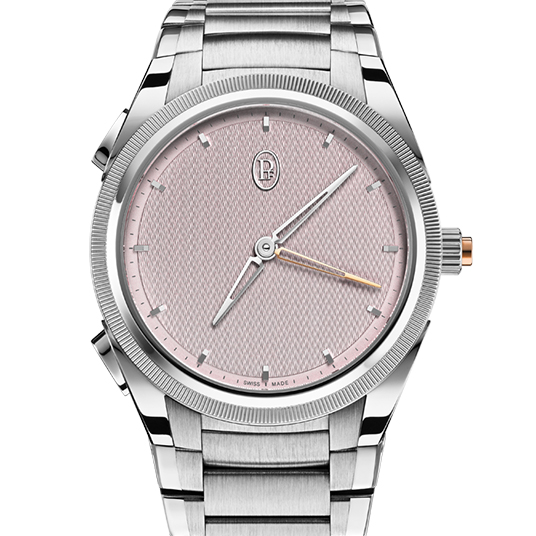 仕様:時・分表示、ミニッツ ラトラパンテ、プラチナ950製ローレット加工ベゼル、ロジウムプレート加工の18Kゴールド製デルタ型スケルトンの時分針、18Kローズゴールド製デルタ型スケルトンのタイマー針、バーリーコーンのハンドギョーシェを施したアークティック・ローズダイヤル、シースルーケースバック