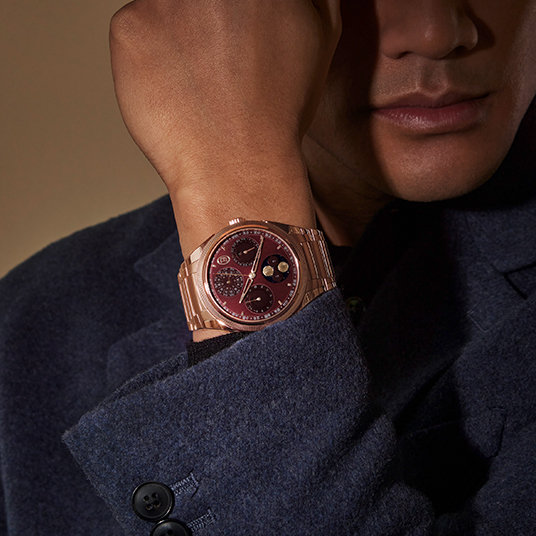 仕様:時・分表示、コンプリートチャイニーズカレンダー、高精度ムーンフェイズ、バーリーコーン(麦の穂)パターンのギョーシェを施したインペリアルレッドダイヤル、ローレット加工ベゼル、シースルーケースバック