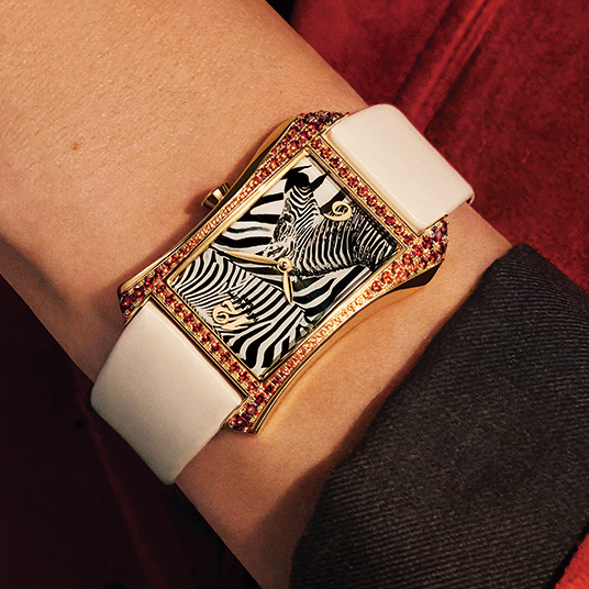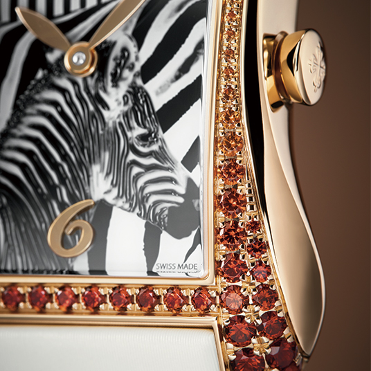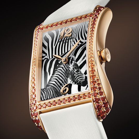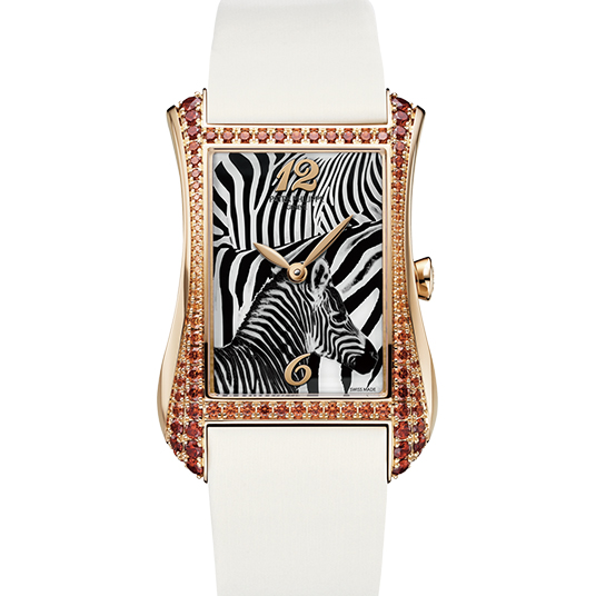 仕様:時・分表示、彫刻とホワイト・ニス塗装によるゼブラ・モチーフを配したメタライズ・サファイヤクリスタル文字盤、94個の《コニャック》から《マンダリン》までのトーンのブリリアントカット・スペサルタイト(2.02カラット)をセッティング