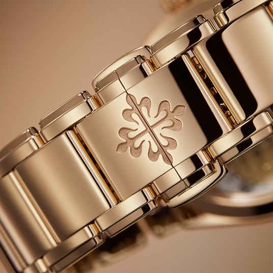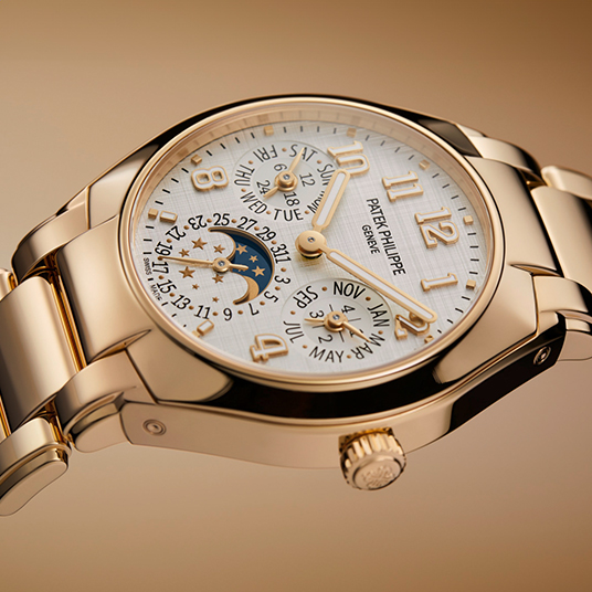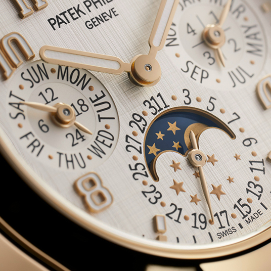 仕様:時・分・日付・曜日・月・閏年表示、ムーンフェイズ、縦横サテン仕上げ(山東絹仕上げ)のシルバー文字盤、サファイヤクリスタル・バック、パテック フィリップ・シール