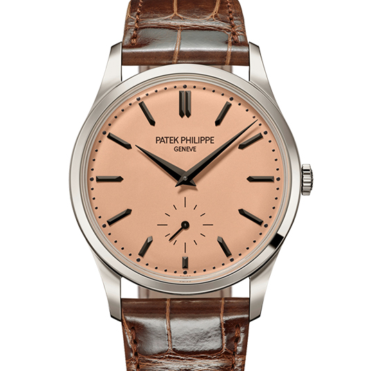 仕様:時・分・秒(スモールセコンド)表示、ローズゴールドめっきオパーリン文字盤、サファイヤクリスタル・バック、パテック フィリップ・シール