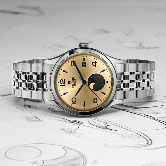 仕様:時・分・秒・日付表示、ムーンフェイズ、サンブラッシュドサテン仕上げのシャンパンカラーダイアル、アプライド アワーマーカー、316スチール製スクリュー式リューズにチューダーロゴのレリーフ