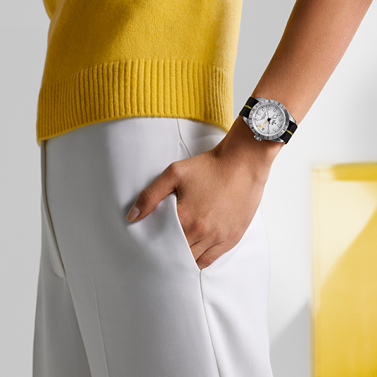 ストラップ:イエローのライン入りブラックファブリックストラップ、ステンレススチール製バックル