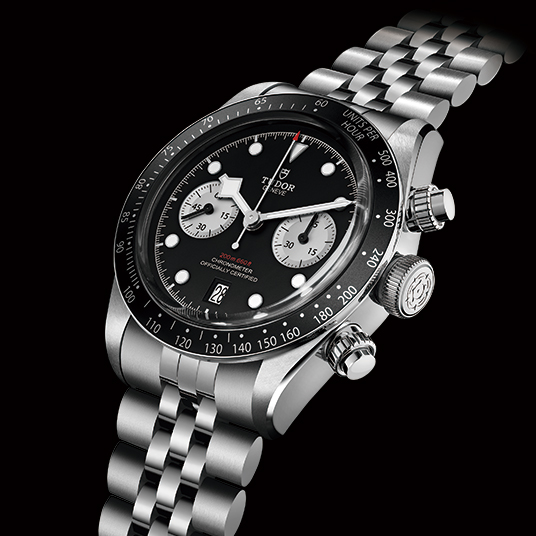 仕様:時・分・秒(スモールセコンド)・日付表示、クロノグラフ、316Lステンレススチール製固定ベゼルにマットブラックのアルマイト加工インサートとシルバーカラーのマーカー付きタキメーター目盛り、シルバーカウンター付きのドーム型ブラックダイアル、316Lステンレススチール製スクリュー式リューズにチューダーローズのレリーフ