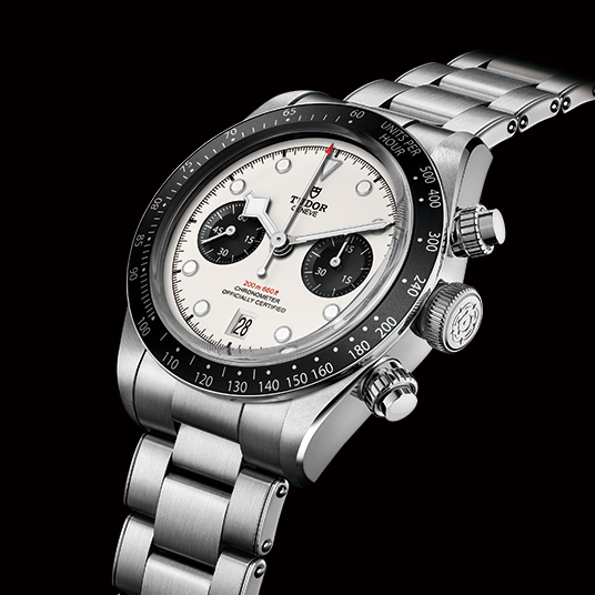 仕様:時・分・秒(スモールセコンド)・日付表示、クロノグラフ、316Lステンレススチール製固定ベゼルにマットブラックのアルマイト加工インサートとシルバーカラーのマーカー付きタキメーター目盛り、ブラックカウンター付きのドーム型オパラインダイアル、316Lステンレススチール製スクリュー式リューズにチューダーローズのレリーフ