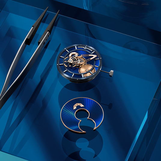 仕様:時・分表示、自軸を中心に回転するフライング・カルーセル・ムーブメント、ホワイトのスーパールミノバ®を施したローズゴールドカラーのミニッツブリッジ、ブルーのギヨシェ彫りエナメル製アワーディスク、ホワイトスーパールミノバ®のインデックス、シースルーケースバック