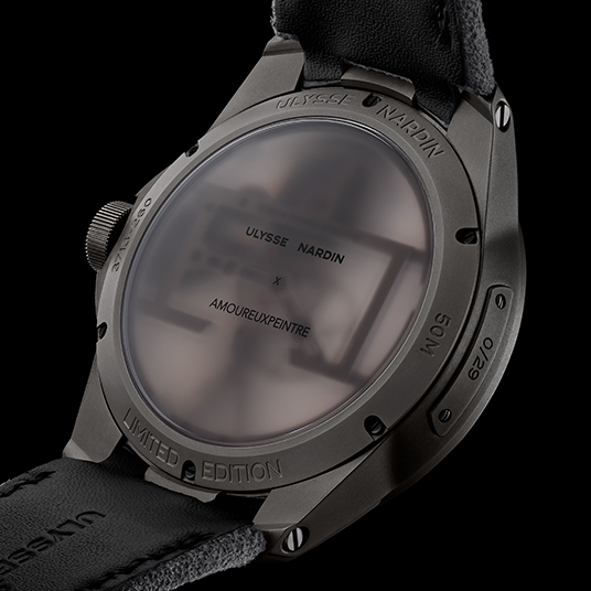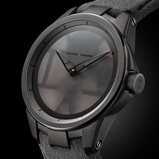 仕様:時・分表示、フロステッドサファイアガラスのスケルトンダイアル、グレーのスーパールミノバを塗布したアンスラサイトの針、アンスラサイトPVDチタン製オープンケースバック、フロステッドサファイアガラス