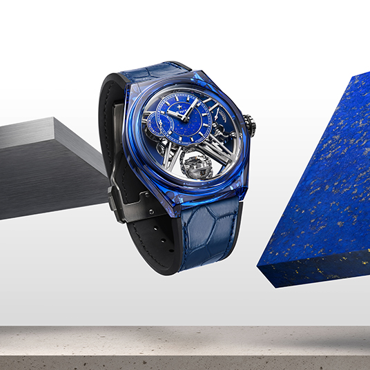 仕様:12時位置にオフセンターの時・分表示、9時位置にスモールセコンド、6時位置に自動制御式「グラビティ コントロール」モジュール、3時位置にパワーリザーブ表示、地板とブリッジに特別なツートーン(ブルー&ロジウム)のシグネチャー+星空の刻印、ジャイロスコープシステムのプラチナ製カウンターウェイトにレーザー加工による装飾、オープンワークのラピスラズリ文字盤