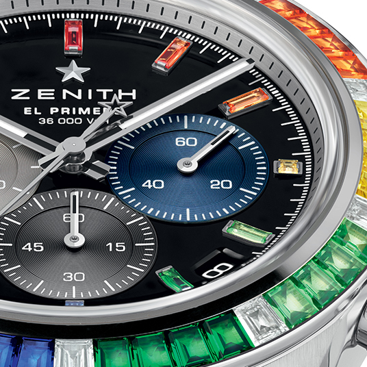仕様:時・分・秒(スモールセコンド)表示、1/10秒計測のクロノグラフ(中央に10秒で1回転するクロノグラフ針、6時位置に60分カウンター、3時位置に60秒カウンター)、レインボーバゲットカットサファイアベゼル、ブラックラッカー仕上げの文字盤、3色カウンター、レインボーサファイアインデックス、スーパールミノバ SLN C1を塗布した針、シースルーケースバック