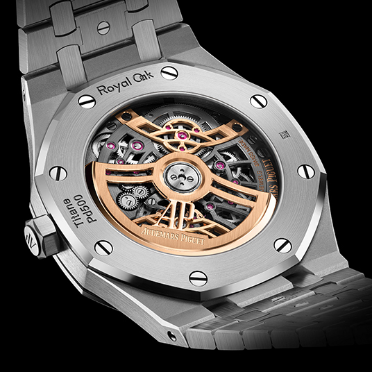 仕様:時・分表示、週番号表示付きパーペチュアルカレンダー(曜日、日付、ムーンフェイズ、月、閏年)、サファイアダイヤル、スモーク仕上げのサブダイヤル、蓄光加工が施されたピンクゴールドのアワーマーカーとロイヤル オーク針、ブラックインナーベゼル、サファイアケースバック、チタン製リューズ
