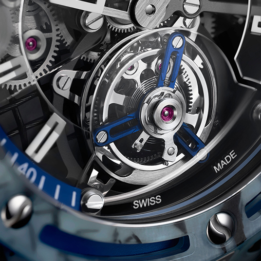 仕様:時・分表示、トゥールビヨン、サファイアクリスタルダイアル、ポリッシュ仕上げのブルーの陽極酸化アルミニウムと反射防止加工のゴリラ強化ガラスのケースバック、シリアルナンバー付き(初回72本、今後ノバクの大会優勝時に本数追加)