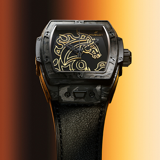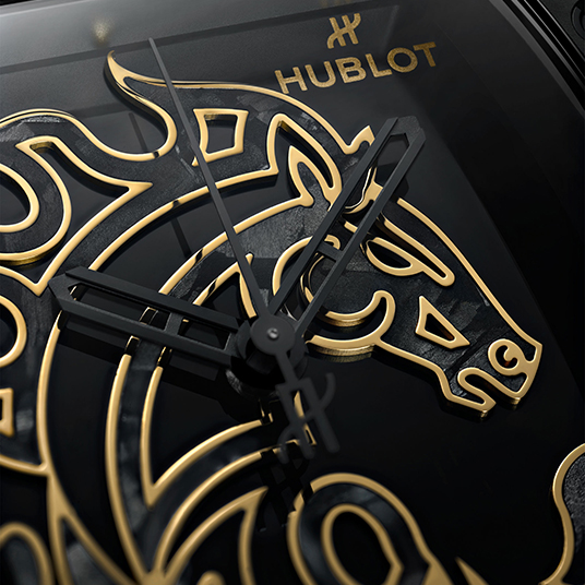 仕様:時・分・秒表示、フロステッドカーボンを施したポリッシュ仕上げのブラックダイアルにホースシェイプのモチーフ、フロステッドカーボンベゼル、サファイアクリスタルケースバック